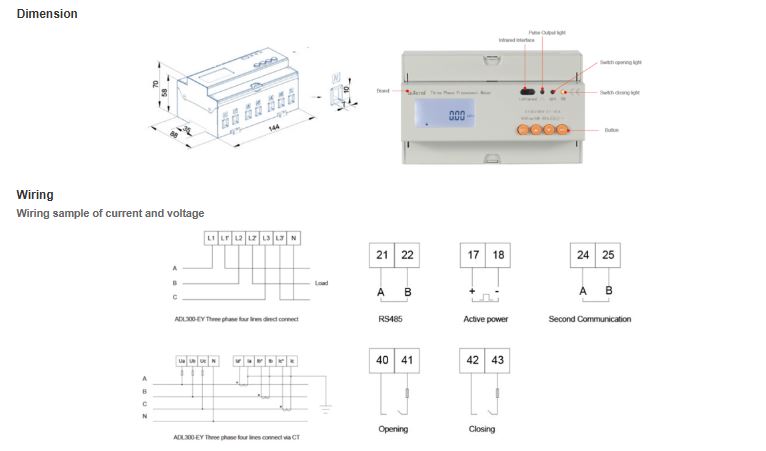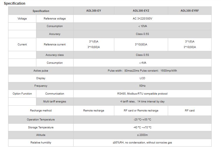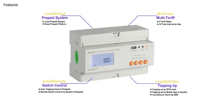 ADL300-EY three phase pre-paid meters with intro-control is used for calculating the three phase active energy respectively on the frequency of 50 Hz. The meter has functions of pre-paid, load controlling and RS485 communication etc. meet the related technical requirements of electronic power meter in the IEC62053-21, IEC62053-22 standards.
