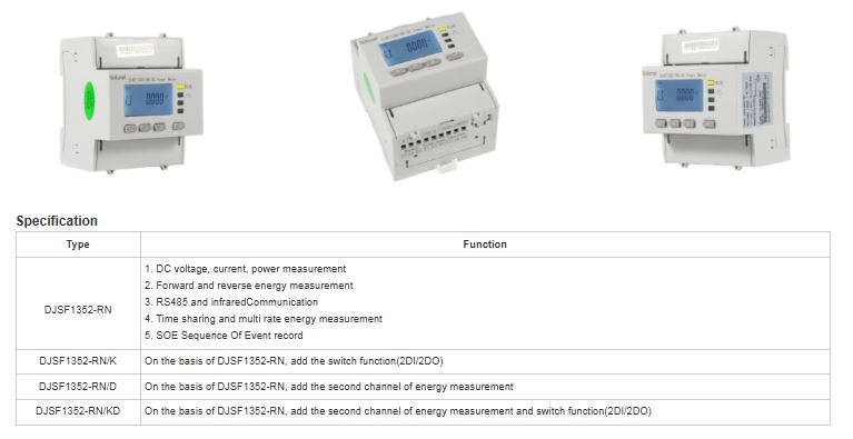 DJSF1352-RN rail-mounted DC power meter with double DC input channels, designed for telecommunications base stations, DC charging piles, solar photovoltaic and other applications, this series of meters can measure the voltage, current, power and forward and reverse energy and so on in the DC system. The actual use of the site, you can measure the total power, but also measure the energy within a specified period of time. The test results can be used for local display, but also with industrial control equipment, computers to form a measurement and control system.