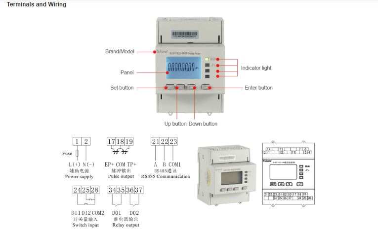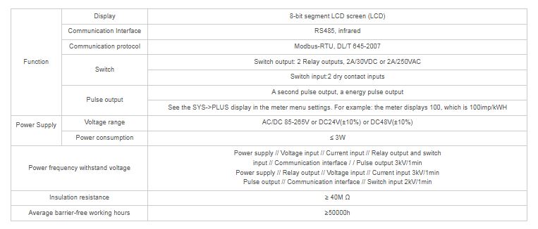 The meter have infrared communication interface and RS485 communication interface, and supports Modbus-RTU protocol and DLT645-97(07) protocol at the same time. The meter have relay alarm output and digital input function. It can set the ratio, alarm and communication through the meter panel keys according to different requirements. The meter have event recording of switch(Modbus protocol), programming and event setting records(645 protocol), instantaneous and timing freeze function of data(645 protocol), maximum and minimum value recording function of voltage and current power.