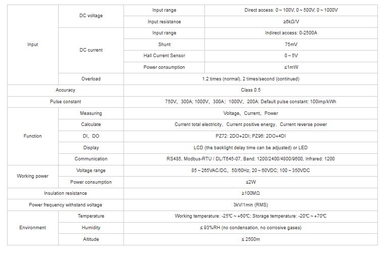 PZ series intelligent DC energy meter is designed for applications such as DC panels, solar power, telecommunications base stations, and charging posts. This series of devices can measure voltage, current, power, forward and reverse power in DC system. It can be used for local display, and connected with industrial control equipment, computers, form a measurement and control system.