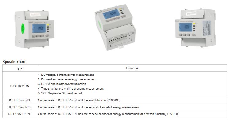 DJSF1352-RN rail-mounted DC power meter with double DC input channels, designed for telecommunications base stations, DC charging piles, solar photovoltaic and other applications, this series of meters can measure the voltage, current, power and forward and reverse energy and so on in the DC system. The actual use of the site,you can measure the total power, but also measure the energy within a specified period of time. The test results can be used for local display, but also with industrial control equipment, computers to form a measurement and control system.