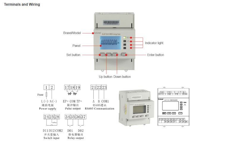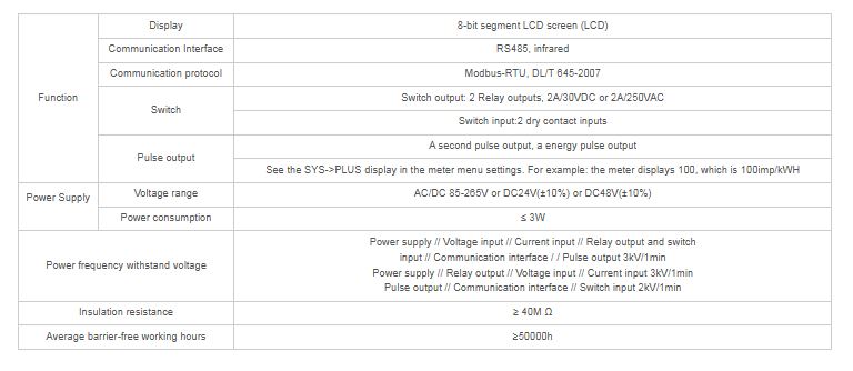 The meter have infrared communication interface and RS485 communication interface, and supports Modbus-RTU protocol and DLT645-97(07) protocol at the same time. The meter have relay alarm output and digital input function. It can set the ratio, alarm and communication through the meter panel keys according to different requirements. The meter  have event recording of switch(Modbus protocol), programming and event setting records(645 protocol), instantaneous and timing freeze function of data(645 protocol), maximum and minimum value recording function of voltage and current power.