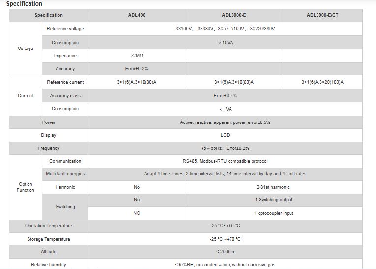 It is fitted with RS485 communication port and adapted to MODBUS-RTU protocol. ADL400 can be used in all kinds of control systems, SCADA system and energy management system (EMS). The meter meets the related technical requirements of electronic meter in the IEC62053-21standards.