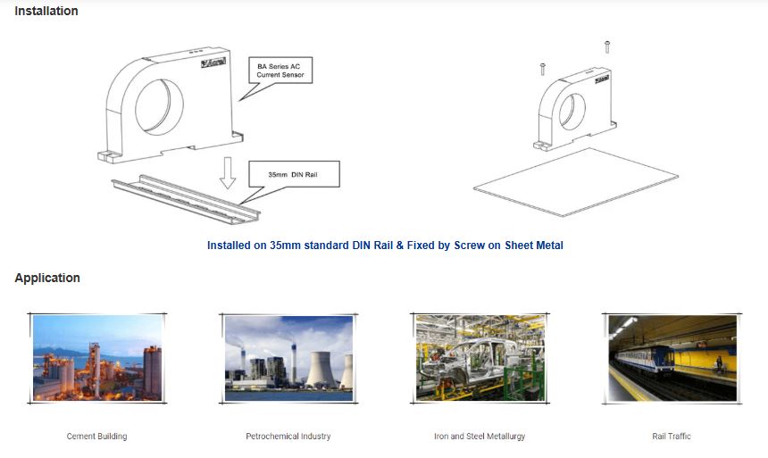 BA series conduct the real-time measurement on the alternating current in the power grid according to the electromagnetic induction theory. They utilize the precise constant current technology and the linear temperature compensation technology to isolate and convert the measured current into the DC signal. They adopt the 24V or 12V power supply. They feature the large overload capacity, high accuracy, isolation and safety and low power consumption. Applications cover the industrial automation sector.